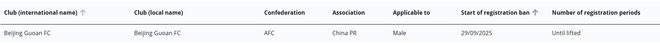 北京国安新增一条转会注册禁令,期限直至该禁令解除
