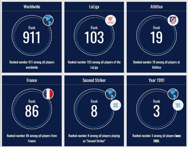 格列兹曼的德转身价目前在西甲排名第103位,位居马竞队内第19,法国国家队第86,在所有二前锋中排名第八。本赛季为马竞出场九次,首发四次,打进两粒进球。赛季前三轮格列兹曼曾失去首发位置,9月逐渐重回主力阵容,且在最近两场对阵法兰克福的欧冠和5-2大胜皇马的西甲中完成破门。格列兹曼今年34岁,在所有1991年出生的球员中身价排名第三,仅次于范戴克和德布劳内。1991年出生球员的身价排行Top51.范戴克 利物浦 2300万欧元2.德布劳内 那不勒斯 2000万欧元3.格列兹曼 马德里竞技 1200万欧元4.克里斯-伍德 诺丁汉森林 1000万欧元5.马赫雷斯 吉达国民 800万欧元