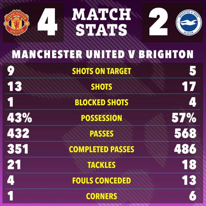 幸好,在超长补时的生死搏杀中进球的是曼联,而非布莱顿。埃登·埃文后场大力传球,本场第300次代表曼联的队长B费巧妙一漏,姆贝莫果断射门,曼联4-2锁定胜局。姆贝莫本赛季的进球数已经有5粒,是全队头号射手。