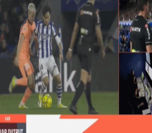 上半场补时阶段,亚马尔在禁区内被踢倒,主裁判毫不犹豫地指向点球点。然而,VAR再次介入,认定在进攻发起阶段已有巴萨球员越位,点球被取消。